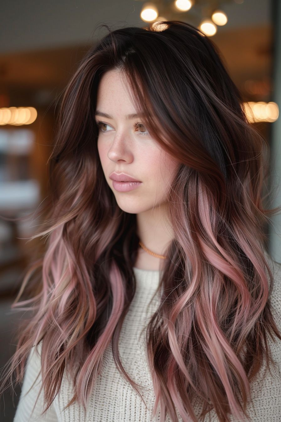 Who says brown has to be basic? This chocolate base infused with muted rosé highlights proves otherwise. It’s trendy yet understated, making it a go-to choice for women who want something modern but not over-the-top. It works well in both winter sophistication and breezy spring settings, thanks to its balanced warmth. The long, tousled waves make it feel relaxed yet chic, suitable for both workdays and nights out.