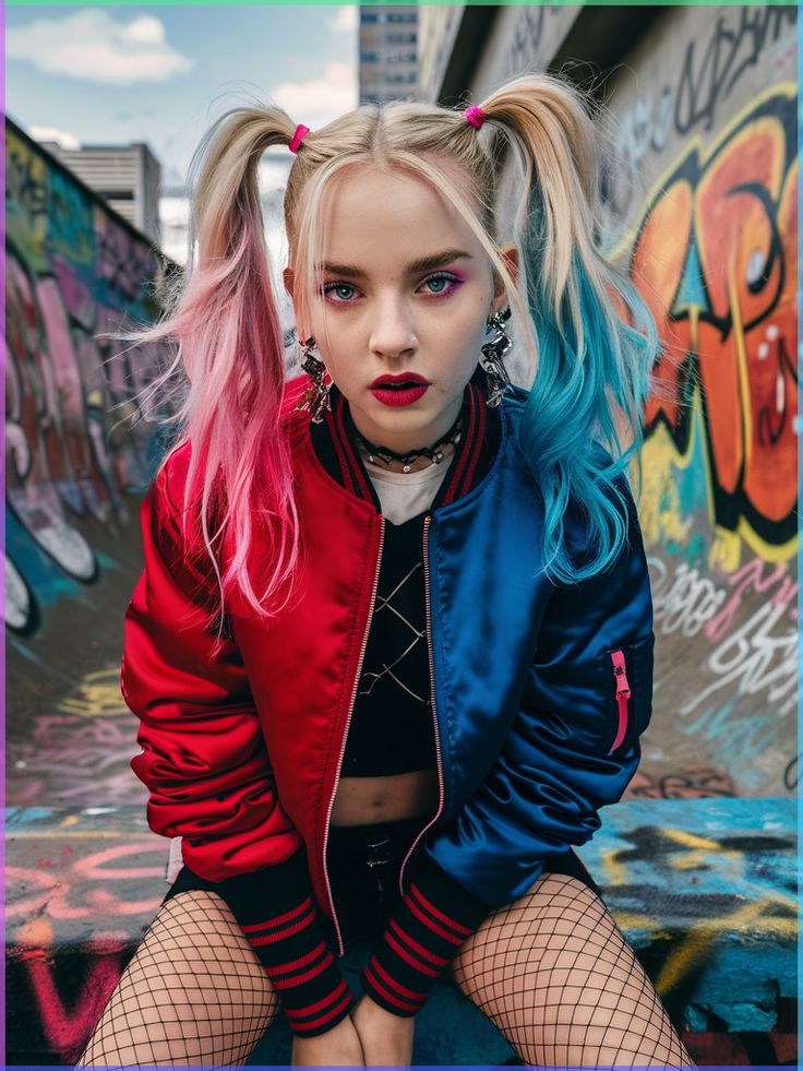 This high-impact look takes its cue from pop culture royalty — two-tone pigtails that channel chaos with a polished punk twist. The curly hair texture is swapped for ultra-straight strands, split cleanly down the middle into vibrant fuchsia and electric blue sections. The bomber jacket’s glossy finish reflects the same red-blue duality, grounding the aesthetic in bold contrast. Black fishnets and layered chokers round out the urban antihero vibe. This look is best suited to confident personalities and angular face shapes — it’s not meant to blend in. Perfect for city parades or themed nightlife events, though perhaps too loud for kid-friendly trick-or-treating.