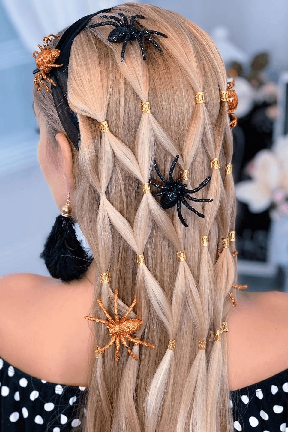 This style takes ethereal long blonde hair and turns it into a delicate web of crisscrossed braids, each section gleaming with golden accents and crawling with oversized glitter spiders. The structure is meticulous—each strand feeds into the next in a laddered lattice, finished with chunky gold beads and anchored by a wide velvet headband. It’s spooky, it’s glam, and honestly? It’s red carpet-worthy.
