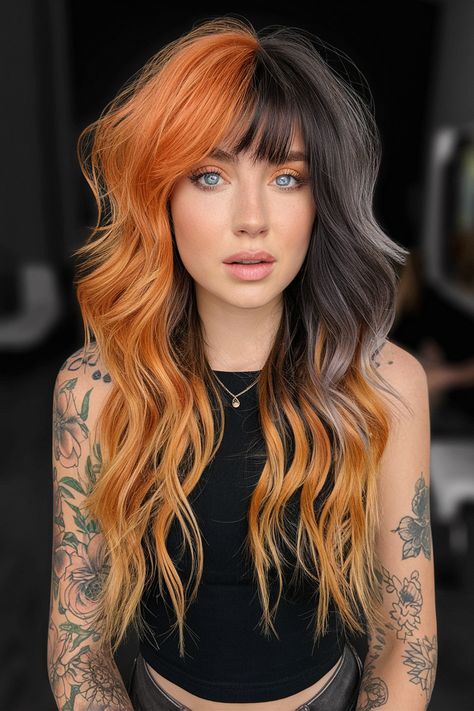 This hairstyle screams Halloween without a single accessory needed. We’ve got a dramatic center part with waves cascading in orange and charcoal-black—a look that says “witchy siren” meets “rockstar edge.” The face-framing color melt makes her eyes pop, and the voluminous texture gives it an effortless cool-girl energy.