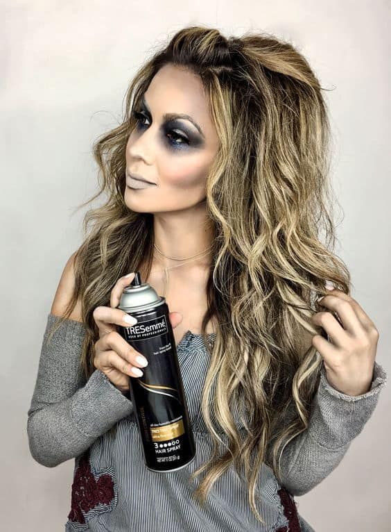 This one’s giving smoky seduction with a haunted twist. Voluminous, teased curly hair, ghostly pale lips, and exaggerated grey eyeshadow create a look that’s both editorial and eerie. Holding a hairspray can mid-style, she’s the poster girl for last-minute glam that still looks intentional.
