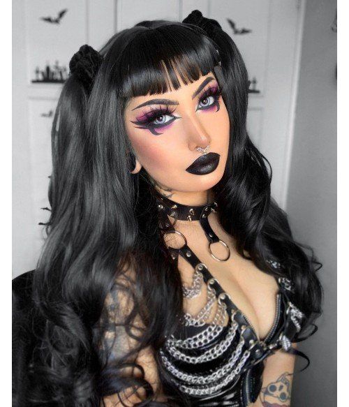 This hairstyle is unapologetically bold—jet-black pigtails styled high on the crown, paired with straight, thick bangs and waves that scream gothic fantasy. The real show-stealer? The statement chain harness across the chest and neck, which adds a rebellious edge that transforms this from costume to runway-level aesthetic. Her eye makeup is electric in shades of purple and magenta, and the dark lipstick seals the look with a perfectly sinister pout.