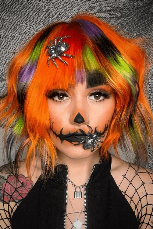 Bold, chaotic, and electric—this bob is Halloween chaos at its most fashion-forward. The jagged orange cut is electrified with streaks of neon green, bright purple, and inky black. Two sparkly silver spiders sit front and center, one clinging to the hair, one to the cheek. The jagged bangs and wild silhouette give off cartoonish, edgy pumpkin energy, while the black zip-up top adds that bit of structure.