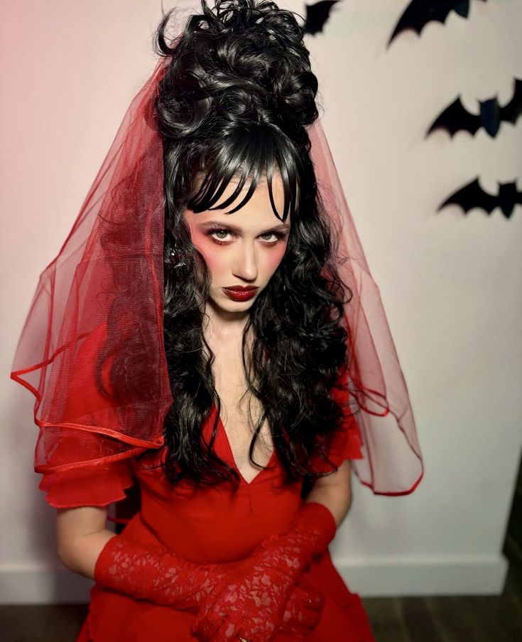 Here we meet the gothic bride of your blood-red dreams. This vampy vision blends curly hair drama with vintage silhouettes, wrapped in a veil of sheer mystery. The towering bouffant hairstyle is anchored with a scarlet veil, adding a ghostly flair that feels both theatrical and romantic. Ideal for costume parties with dim lighting and dramatic entrances, but not the best fit for minimalist types or humid climates (this volume needs dry air to survive).