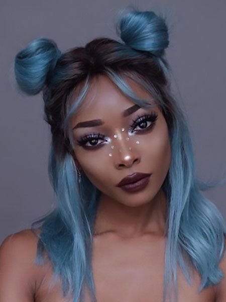 This icy blue hairstyle is giving ethereal alien princess meets cyber club kid — and I am here for it. The double space buns are sculpted yet soft, sitting atop cool-toned locks with a subtle ombré fade. The makeup takes it intergalactic with rhinestone constellations scattered across the nose bridge, creating a delicate shimmer without being overly costume-y. Great for indoor Halloween events, rave-inspired parties, or last-minute transformations that still feel intentional. Best on oval and heart-shaped faces.