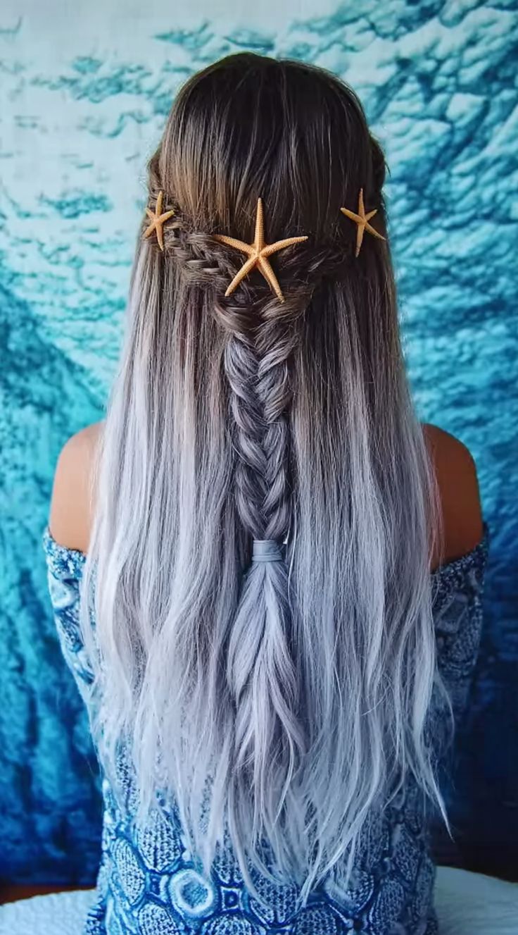 Accessories: Three natural-toned starfish pins cradle the braid, creating a crown effect.