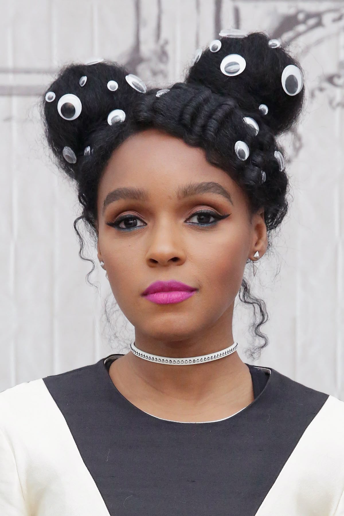 Hair: Thick natural coils styled into two high buns. Buns are covered in various-sized googly eyes for a fun, animated look.