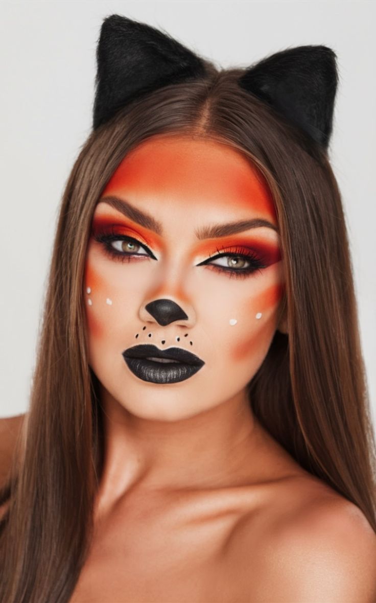 Makeup: Orange-to-red ombré contour, dramatic black lip, bold graphic liner, and faux freckles to emulate whiskers.