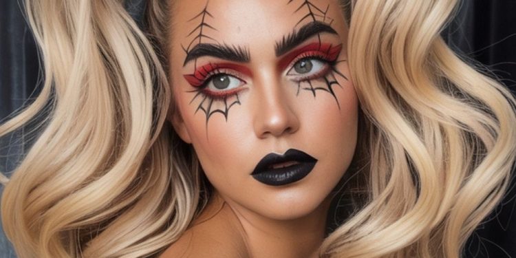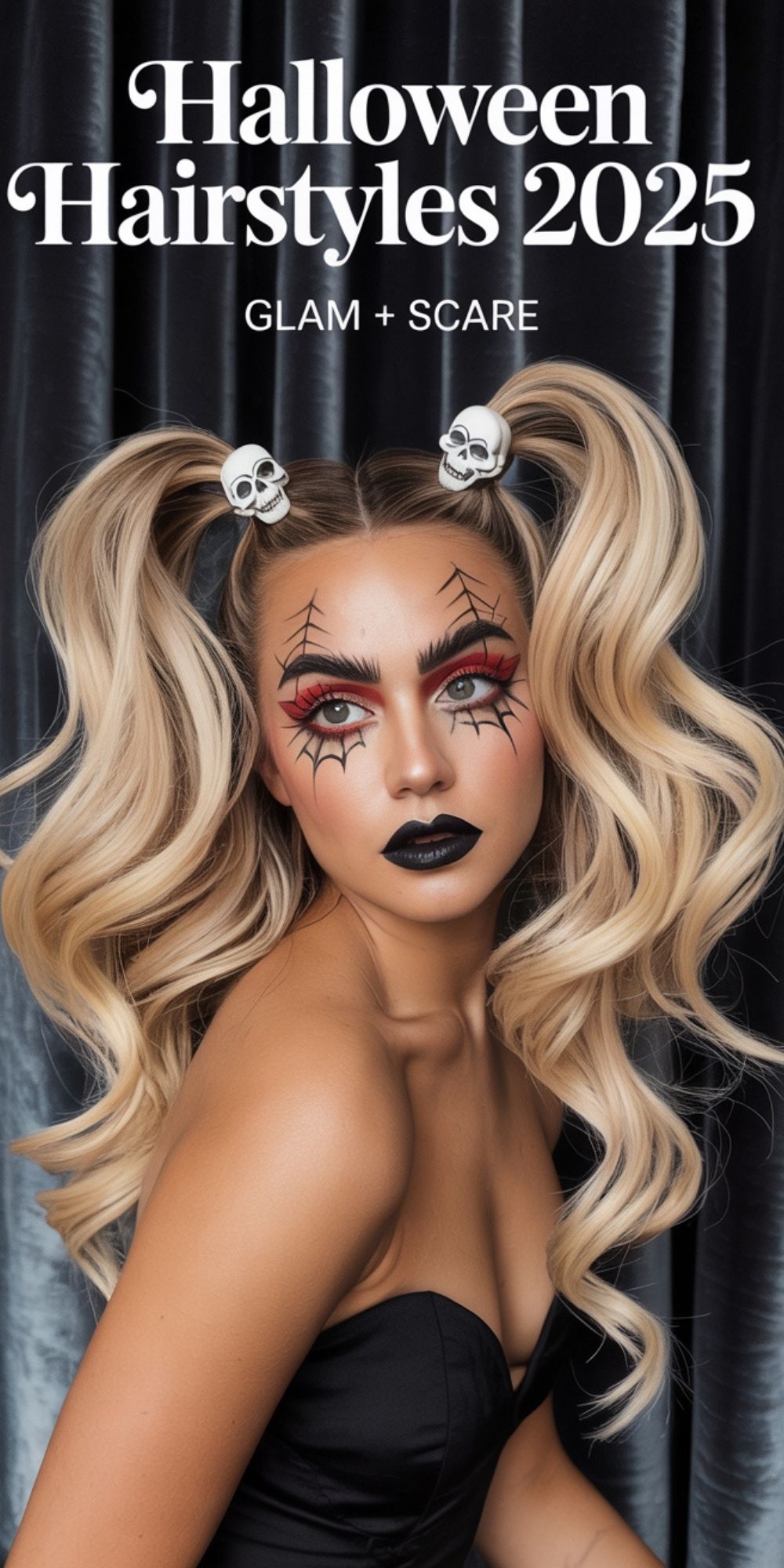 If I were styling this, I’d add a few thin, loose curls falling in front to soften the face and add dimension. What not to do? Skip neon or pastel spiders—it’ll dilute the Halloween vibe. Stick to rich, glittered tones to keep the look cohesive and striking.