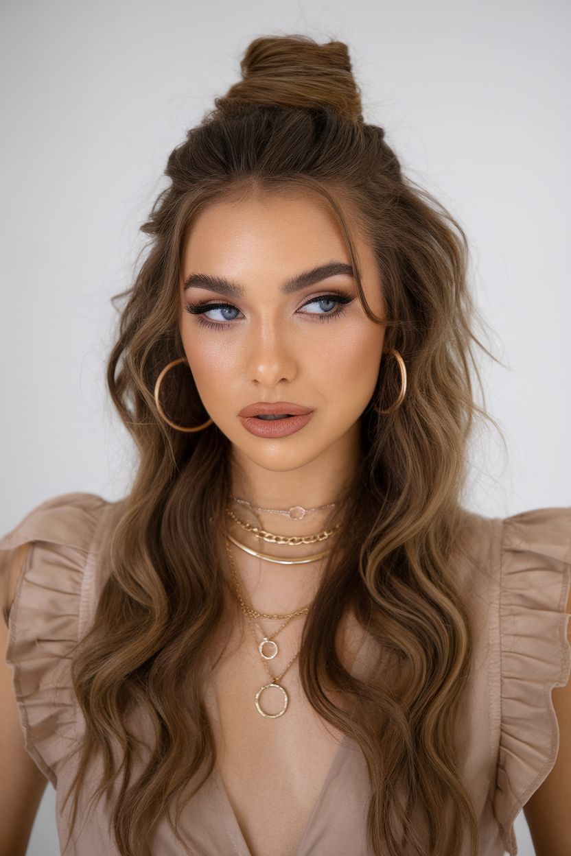This voluminous half up half hairstyle has “holiday goddess” written all over it. With teased crown volume and flowing, brushed-out waves, it suits anyone looking for long hair ideas that feel both regal and playful. It’s appropriate for everything from elegant dinners to kids’ parties where you still want to look put together but not overdone.