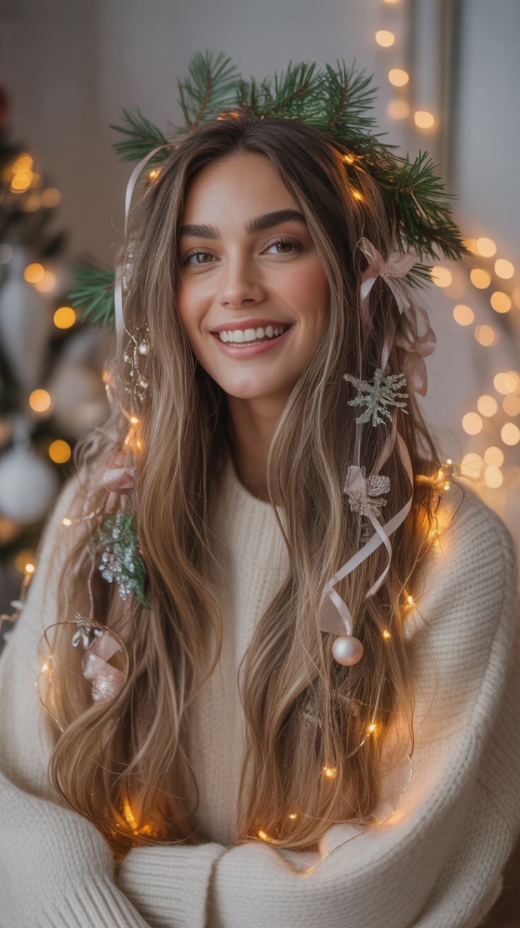This is the kind of hairstyle that captures holiday spirit instantly. Flowing long hair decorated with fairy lights, greenery, and soft ribbon accents—it’s fun, festive, and youthful. Perfect for kids holiday parties, family photos, or cozy evenings. Not so practical outdoors at a snowy market, but perfect indoors.