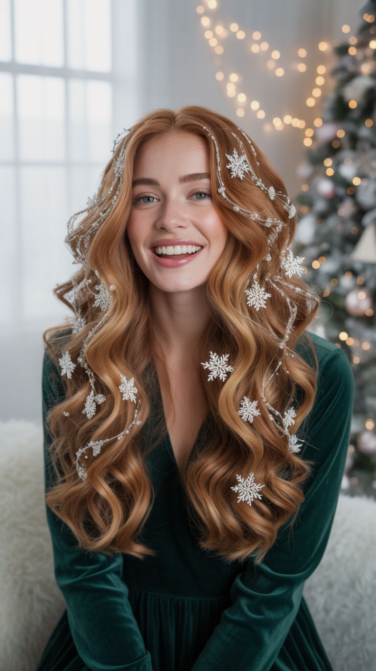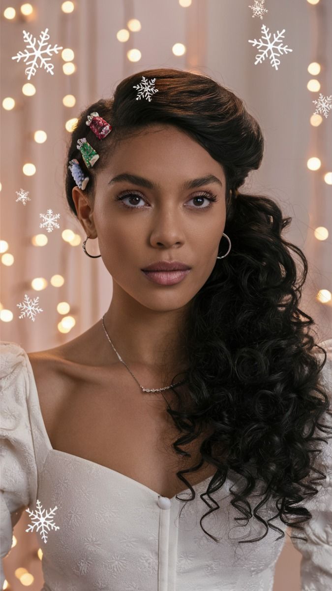 This is elegance with a whimsical touch: voluminous curly hair styled with delicate snowflake accessories. It feels straight out of a Christmas movie scene and is perfect for Christmas gatherings, winter balls, or festive photo shoots. Best on long hair and medium-length styles, but less suited to short hair or bob cuts where accessories can overwhelm.