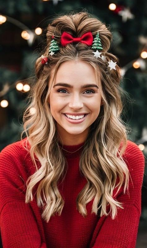There’s something irresistibly cute about this style: a half up half look with bouncy curly hair, decorated with a bright red bow and festive mini ornaments. This hairstyle screams Christmas fun, ideal for casual family gatherings or even kids braids adapted with accessories. It works best for medium hair and long hair lengths, especially when styled into waves.