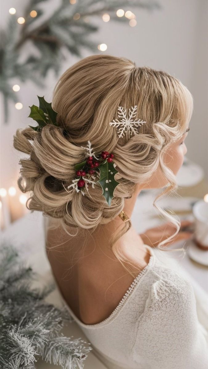 For those who love refined glamour, this soft curled updo adorned with holly berries and snowflake pins is a masterpiece. It’s perfect for Christmas Eve dinners, formal galas, or even winter weddings. Works beautifully on medium hair to long hair, though less practical for short hair or bob cuts.