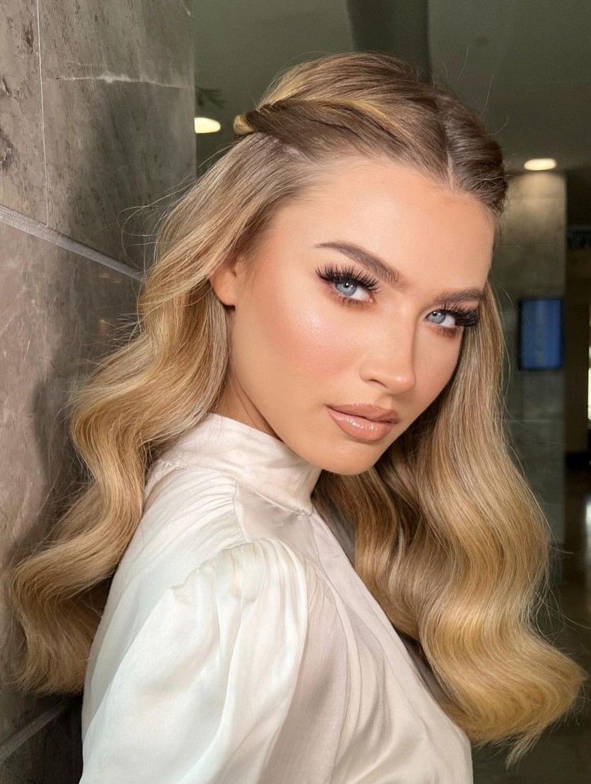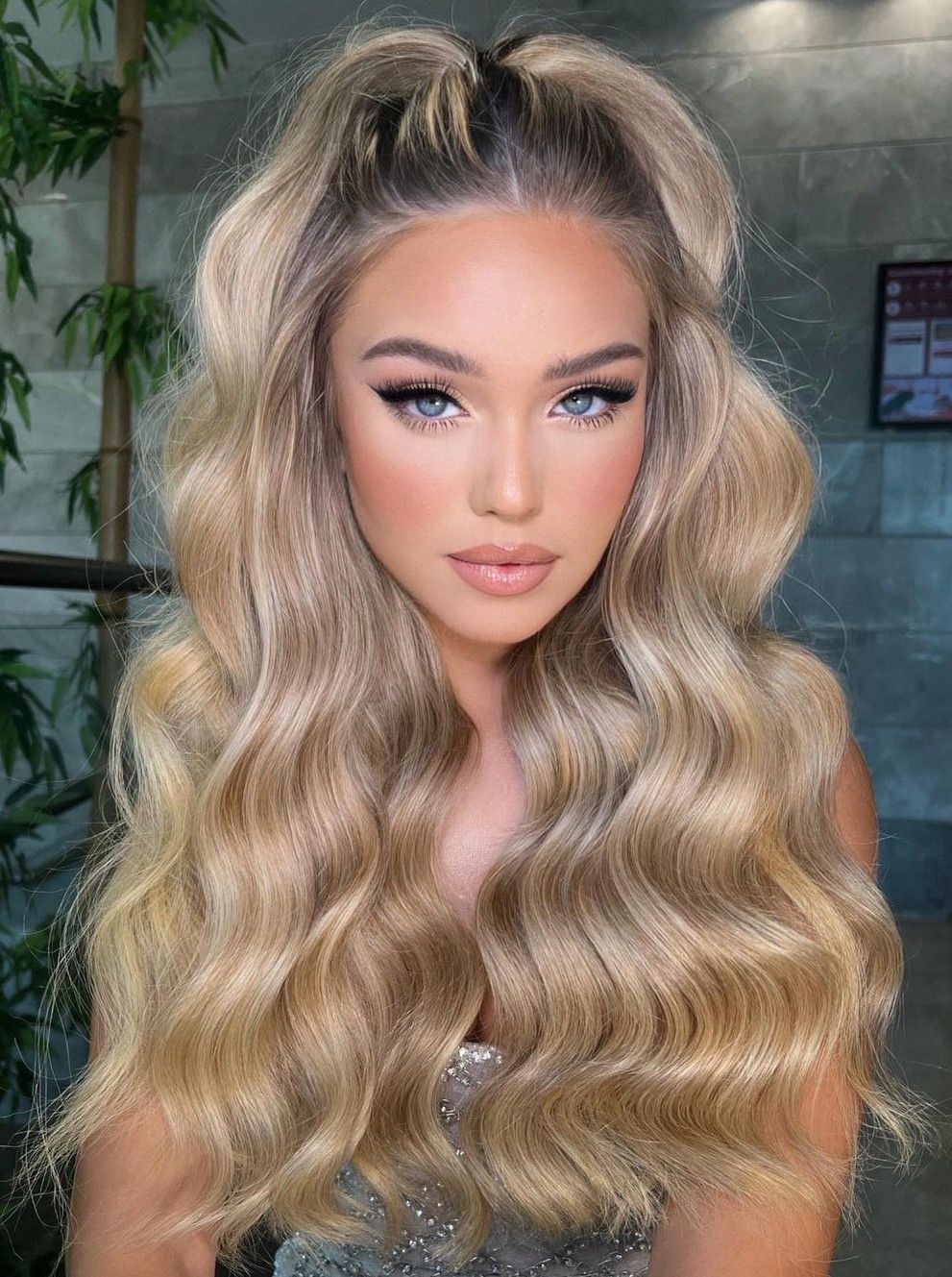 Brushed-out blonde waves: romantic, soft, and camera-friendly.