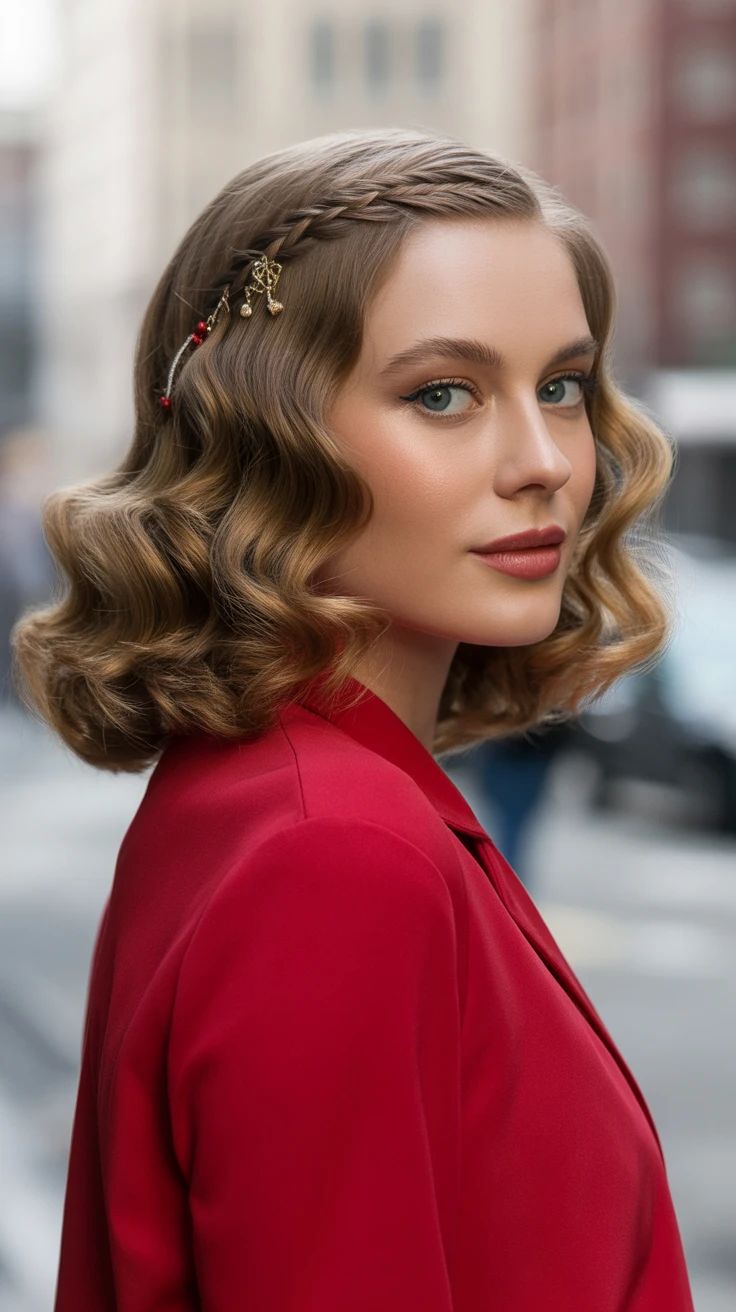 Here’s a hairstyle that blends short hair chic with timeless glam. The sculpted retro waves, combined with a small side braid, create a polished yet natural finish. It’s perfect for city holiday dinners or even an office Christmas party. Less suitable for very casual moments like lounging at home.