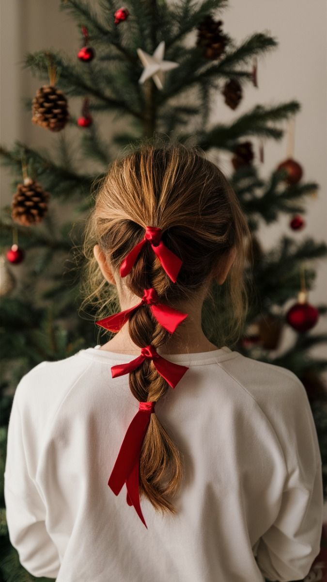 Holiday styling isn’t just for adults—kids braids with ribbons make festive mornings even sweeter. This style combines a simple ponytail braid with bright red bows at every section, making it the ultimate Christmas hairstyle for little ones. Cute, practical, and comfortable—it’s perfect for family gatherings and even school holiday events.