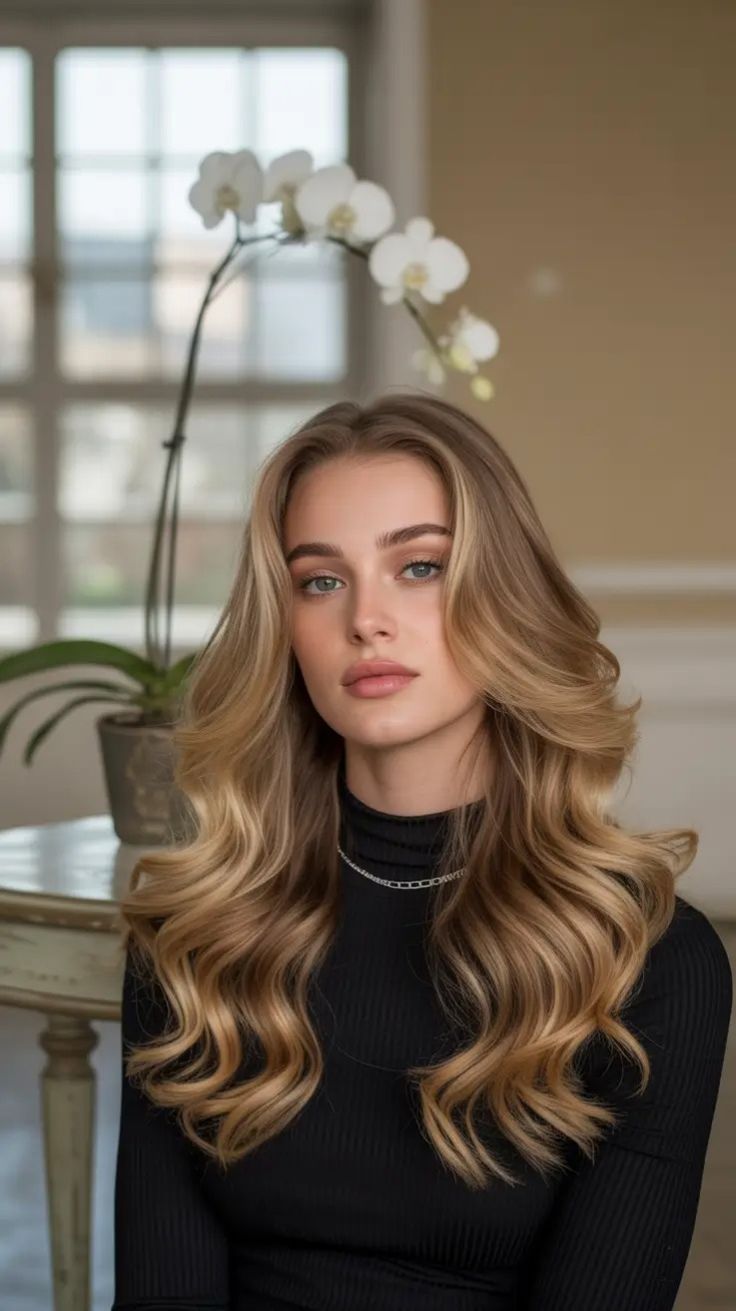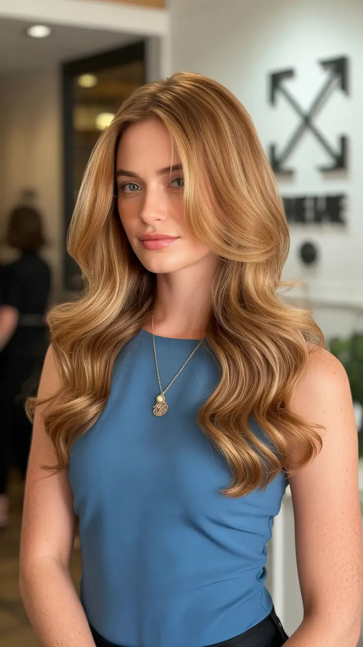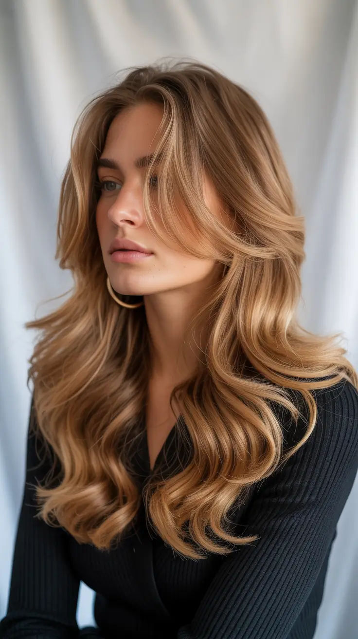 There’s no denying the sophistication of this long, voluminous style. The soft highlights and lowlights melt seamlessly from root to tip, creating a luminous halo effect that feels both polished and natural. The gentle bend at the ends adds body without overdoing it—a perfect example of understated luxury. This look flatters most face shapes, especially oval and heart-shaped, and pairs beautifully with minimalist outfits or sleek eveningwear.