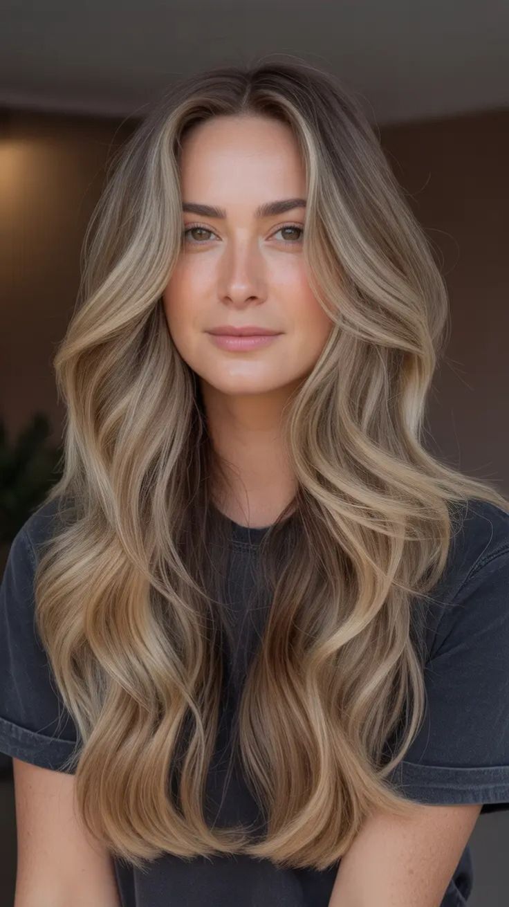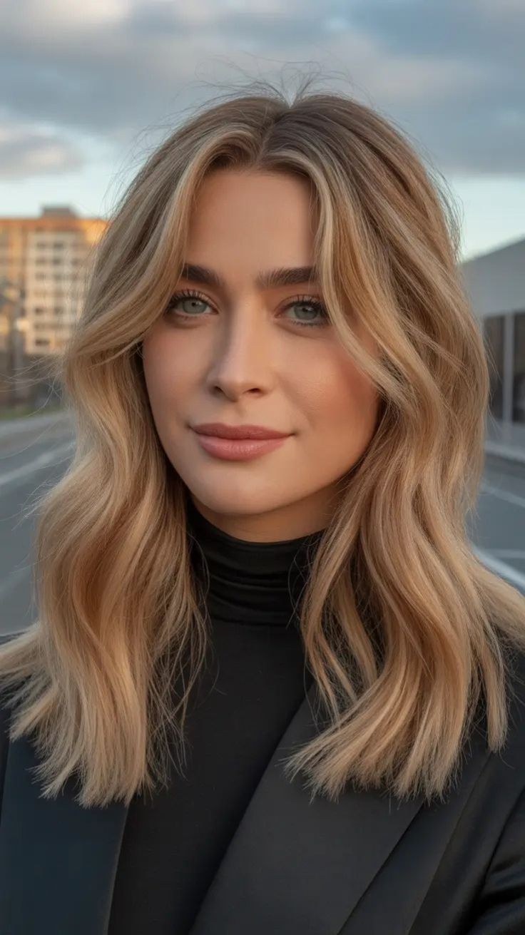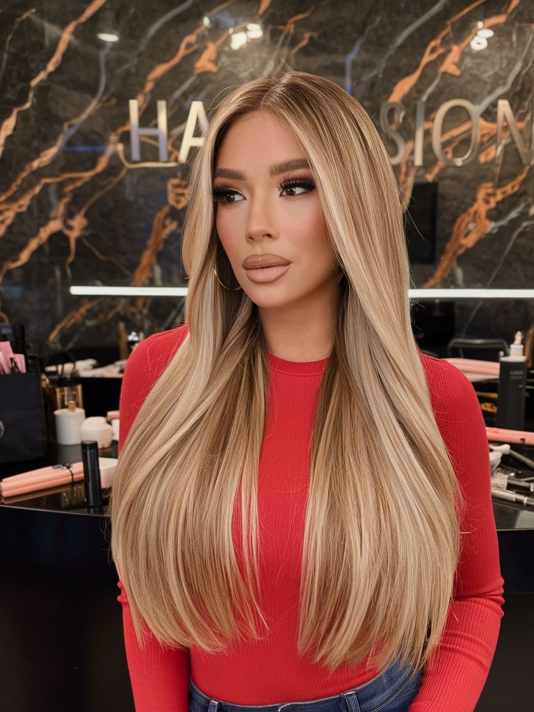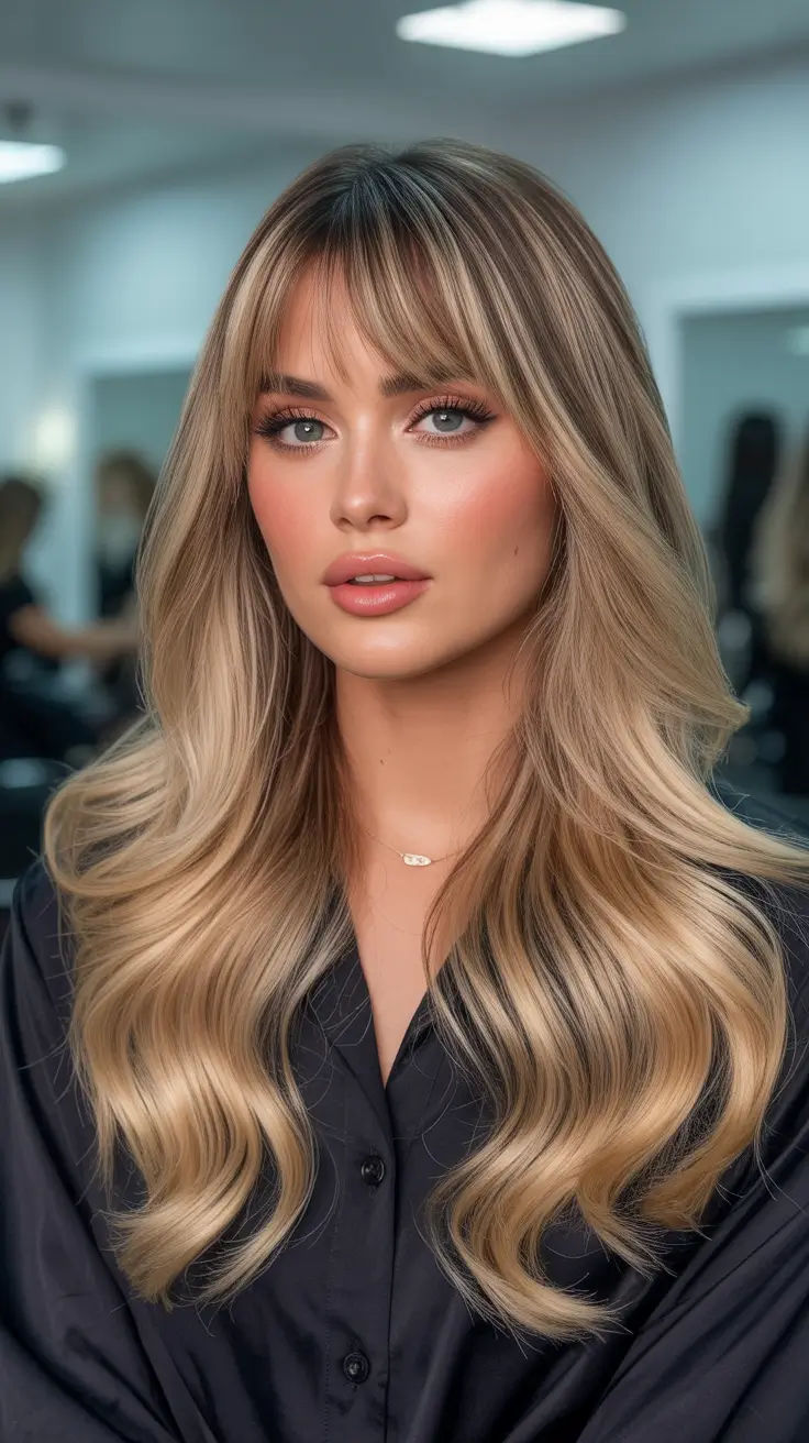 There’s no denying the sophistication of this long, voluminous style. The soft highlights and lowlights melt seamlessly from root to tip, creating a luminous halo effect that feels both polished and natural. The gentle bend at the ends adds body without overdoing it—a perfect example of understated luxury. This look flatters most face shapes, especially oval and heart-shaped, and pairs beautifully with minimalist outfits or sleek eveningwear.