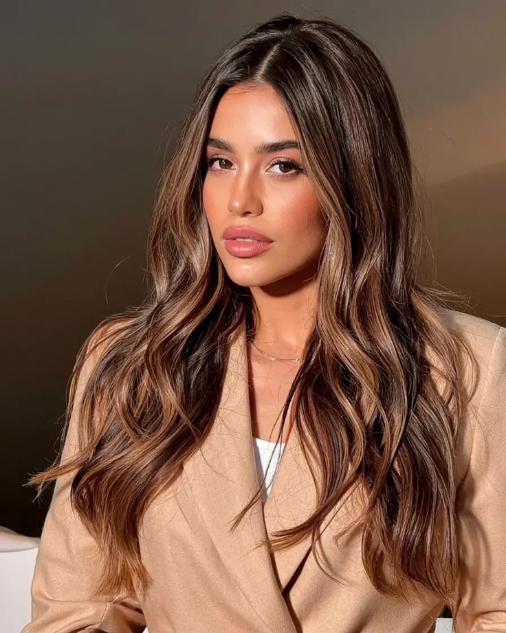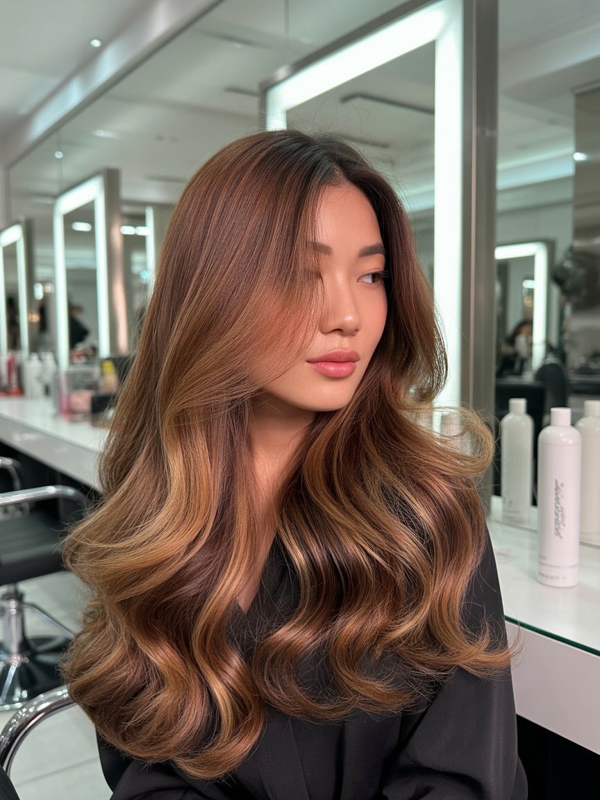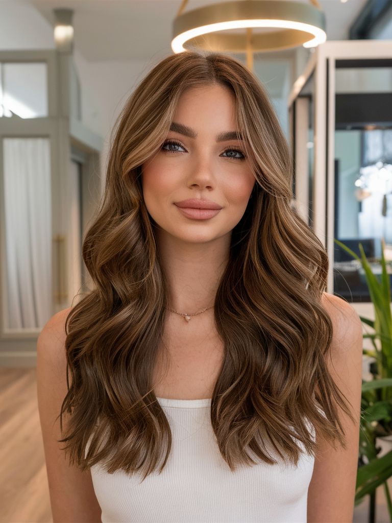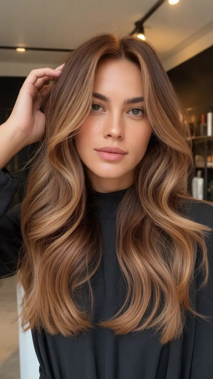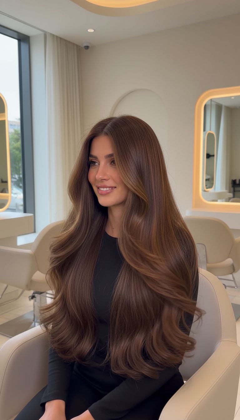 The first look sets the tone for 2026: ultra-long, soft, cascading waves with a smooth honey-chocolate undertone. The shine is what immediately pulls you in — it’s that liquid-glass effect that works beautifully in professional settings, date nights, or even everyday minimal dressing. This version of Honey Brown is especially flattering for balanced face shapes and women who love movement without needing curls. It’s practical too — elegant on its own and chic with simple black basics.