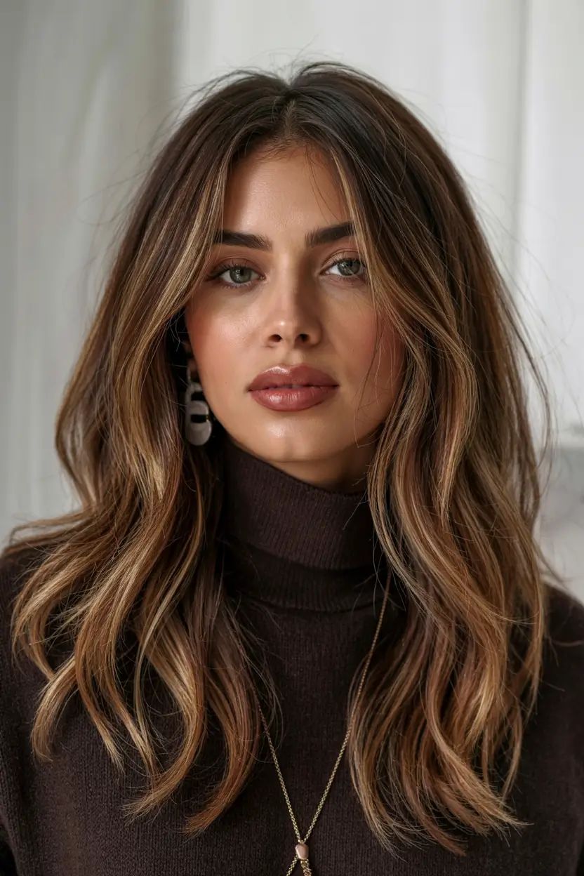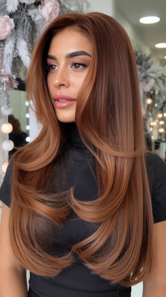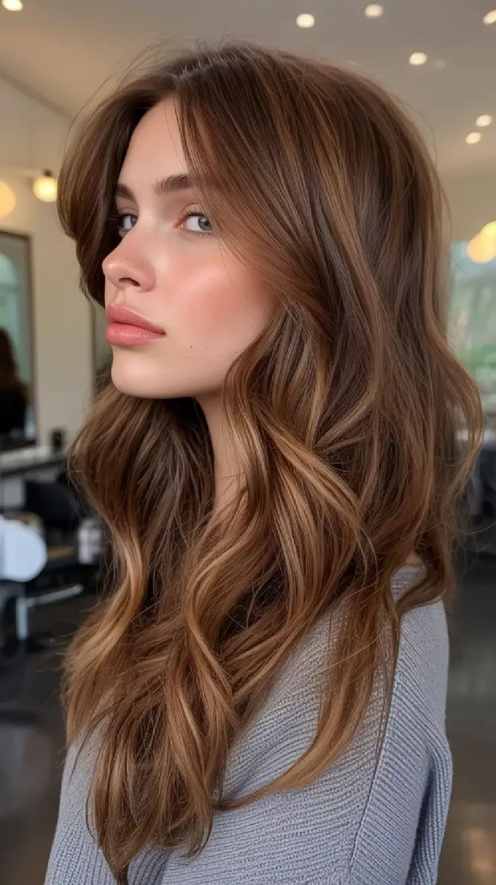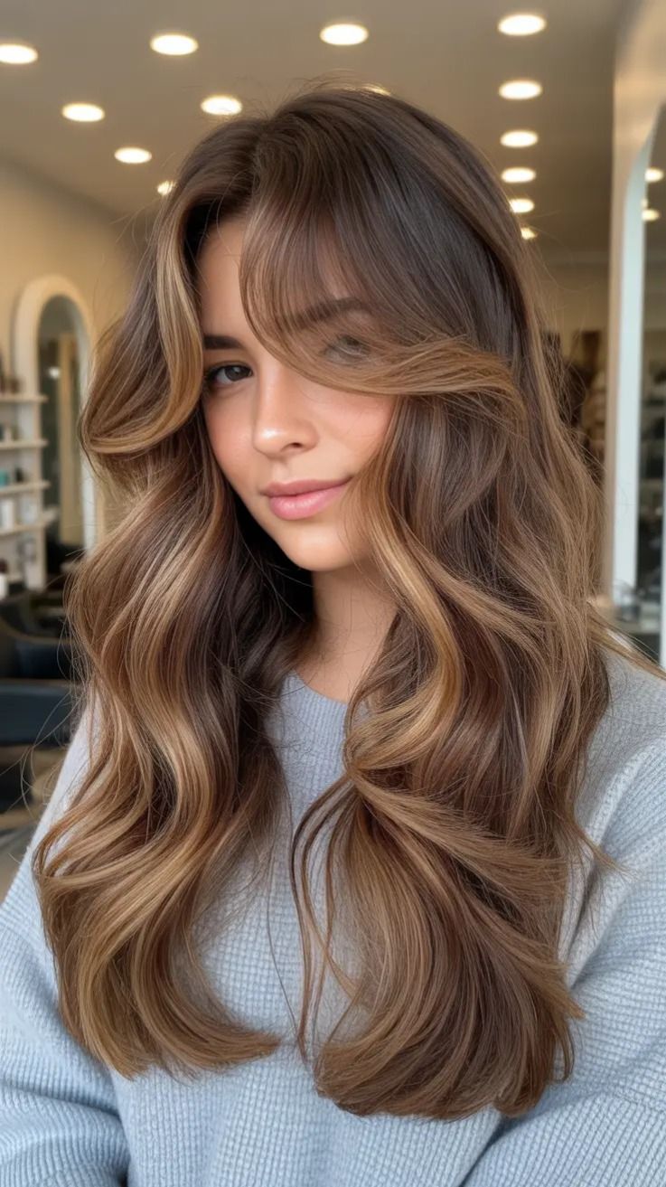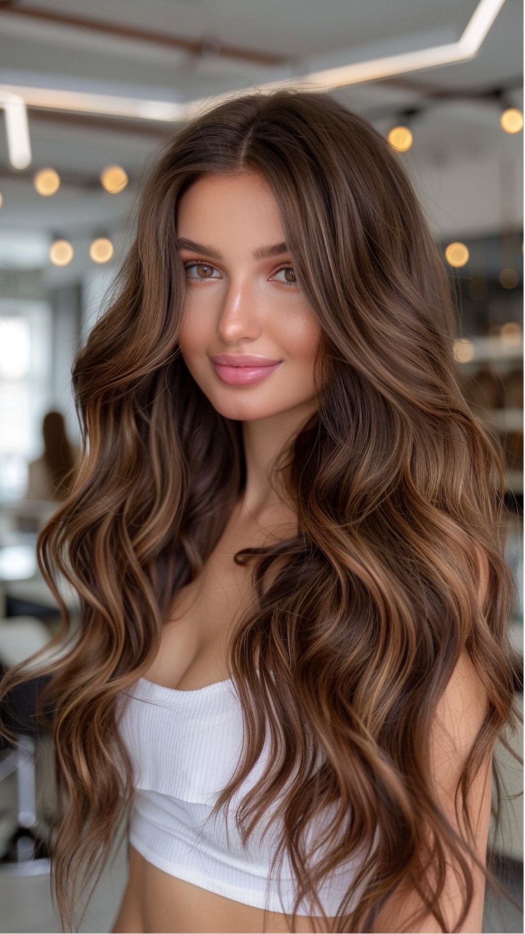 The first look sets the tone for 2026: ultra-long, soft, cascading waves with a smooth honey-chocolate undertone. The shine is what immediately pulls you in — it’s that liquid-glass effect that works beautifully in professional settings, date nights, or even everyday minimal dressing. This version of Honey Brown is especially flattering for balanced face shapes and women who love movement without needing curls. It’s practical too — elegant on its own and chic with simple black basics.