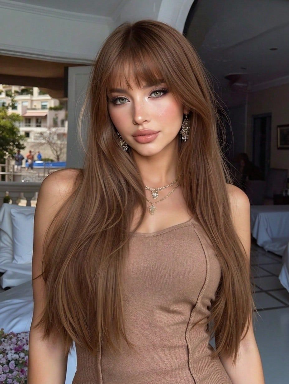The long, silky strands paired with a soft fringe create an enchanting, romantic mood. The colour sits softly between honey and warm brown, making the eyes stand out beautifully. This style is perfect for someone who loves femininity and movement, especially in eveningwear or polished daytime looks. The fringe makes it best for those willing to maintain trims every 4–6 weeks.