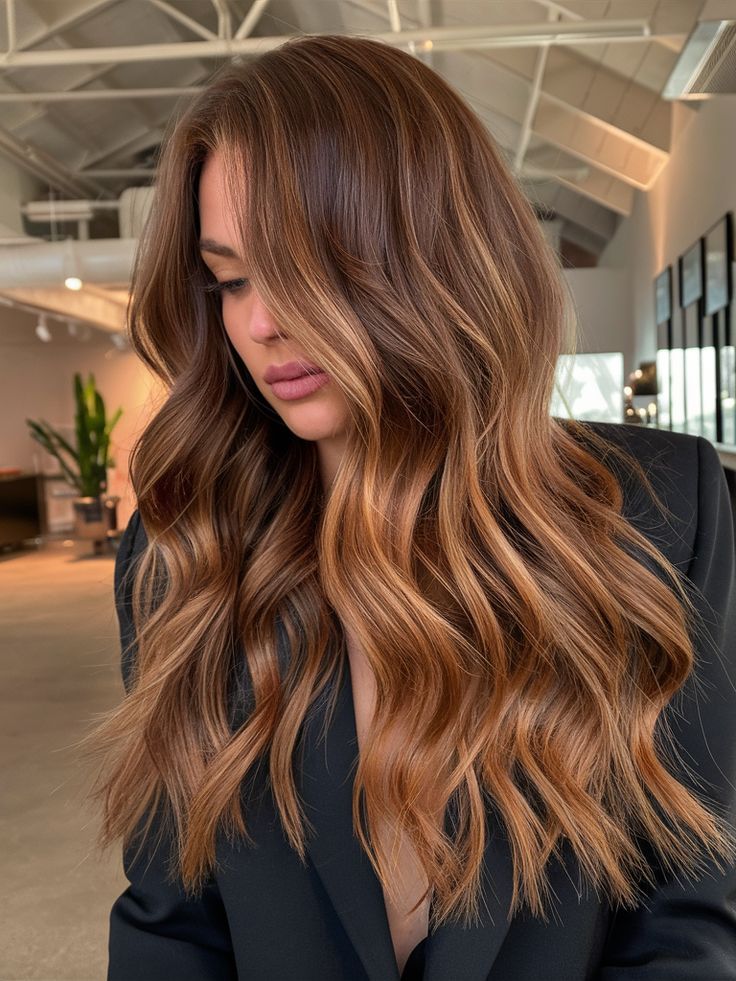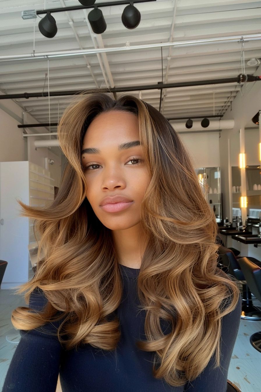 This look is pure volume heaven: big, glamorous swooping layers infused with golden and caramel ribbons. The deeper roots add contrast, making the curls look even fuller and more dimensional. It’s amazing for events, photos, or moments when you want commanding presence. Less ideal if you need ultra-low maintenance, because this style lives on blowouts.