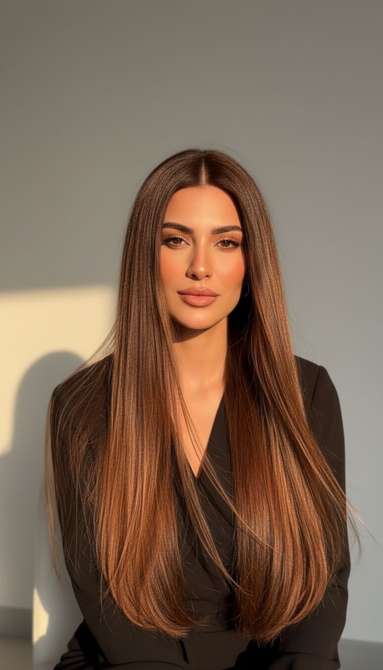 This sleek, center-parted style is the definition of modern elegance — a polished Honey Brown with a sunlit glow running from root to tip. It’s a great choice for office settings, evening events, and polished tailoring. Because the shade leans toward honey-caramel smoothness, it flatters both light skin women and medium brown skin tone beautifully. It’s not ideal for extremely curly textures unless you enjoy frequent straightening sessions.