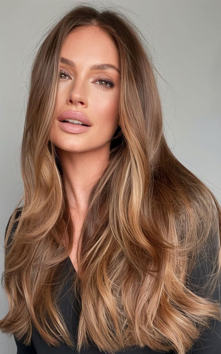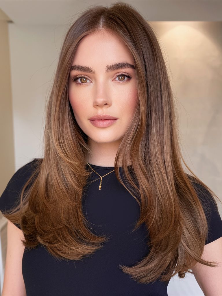 The long, flowing layers here are the epitome of natural glam. With softly blended balayage in light brown shades, this look flatters medium to long hair lengths and especially enhances green eyes, as the contrast makes them pop. The practical beauty of this style is that it works as easily for an office day as it does for a dinner out, without needing constant styling upkeep.