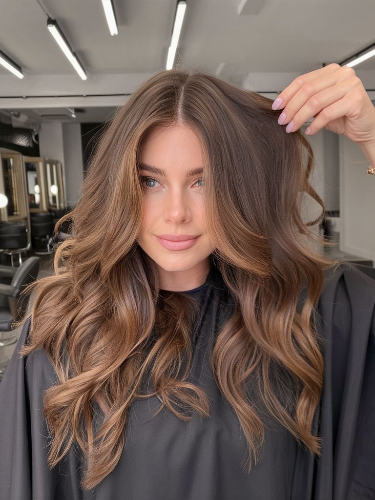 This style embodies that natural softness everyone’s craving in 2025. Long, voluminous curls paired with delicate babylights give a fresh, romantic vibe. The base is medium brown with warm tone highlights, a combination that suits both casual daytime outings and more formal evening looks.