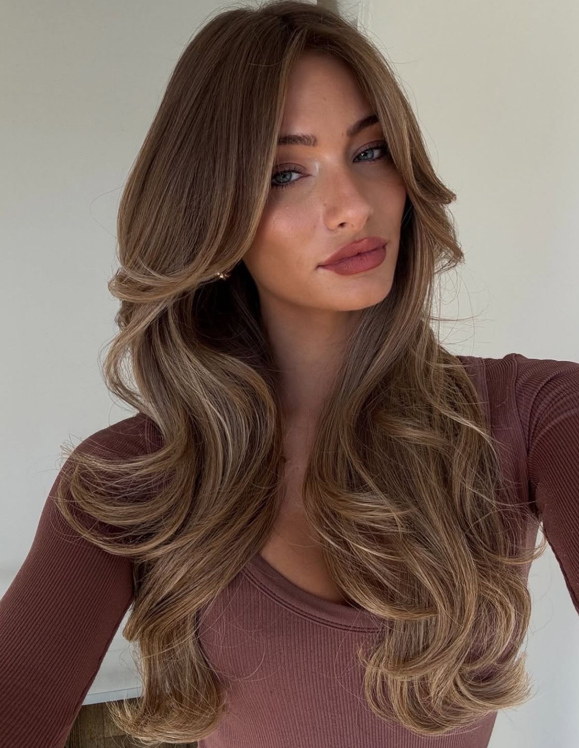 This look takes inspiration from ‘90s blowouts — big, bouncy, and unapologetically glamorous. The rich shades of light brown here lean slightly toward a dark blonde finish, making it versatile for both warm and cool skin tones. It’s ideal for medium-to-long hair and thrives in settings where you want to make an entrance — think cocktail parties, chic dinners, or fashion events.