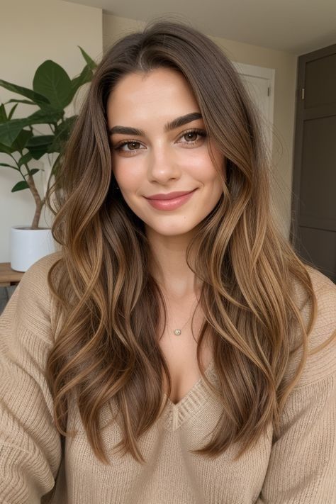 This look showcases long, voluminous layers cascading down in a smooth flow, perfect for enhancing oval and heart-shaped faces. The highlights warm tone add brightness without pushing into blonde territory, making it a versatile option for women who want a subtle shift from darker brunettes. It’s an ideal style for dinner dates, business settings, or any event where polish is key. Less practical for high-humidity days, though, as the bounce may require maintenance.