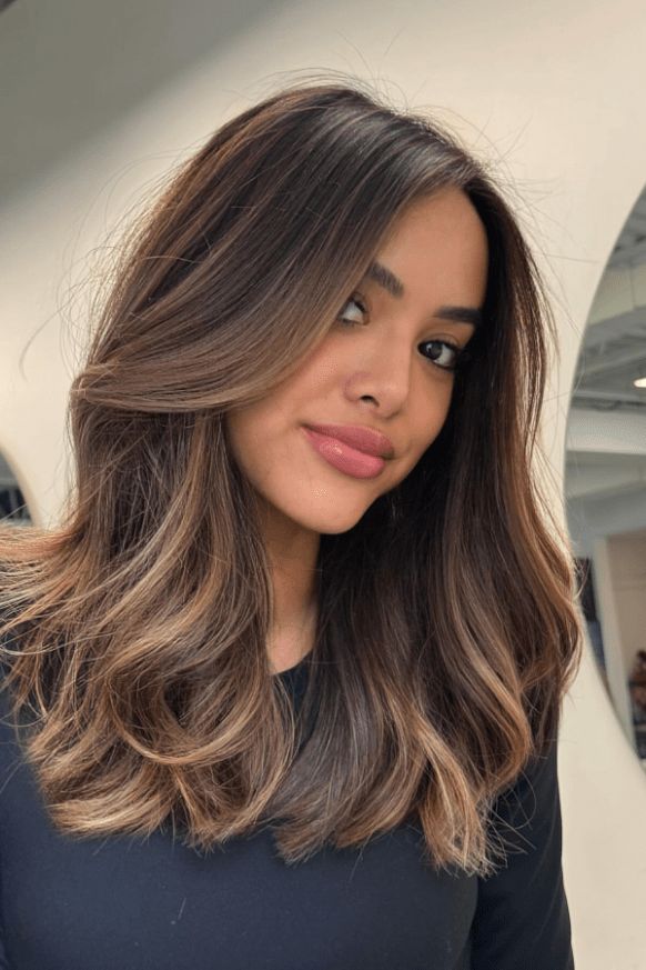 This cut celebrates body and bounce, showing off a balayage technique that blends natural brown with soft lowlights. It flatters medium-to-thicker hair textures and rounder face shapes by creating width and fullness without overwhelming. It’s polished enough for office wear but stylish enough for nightlife.