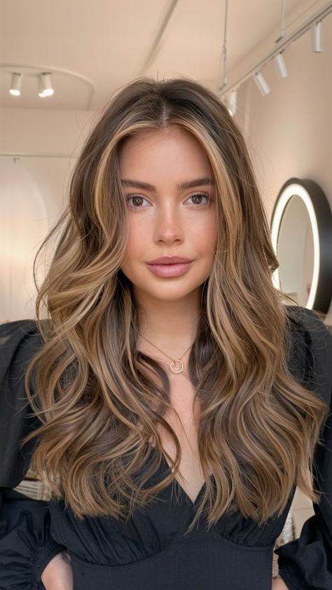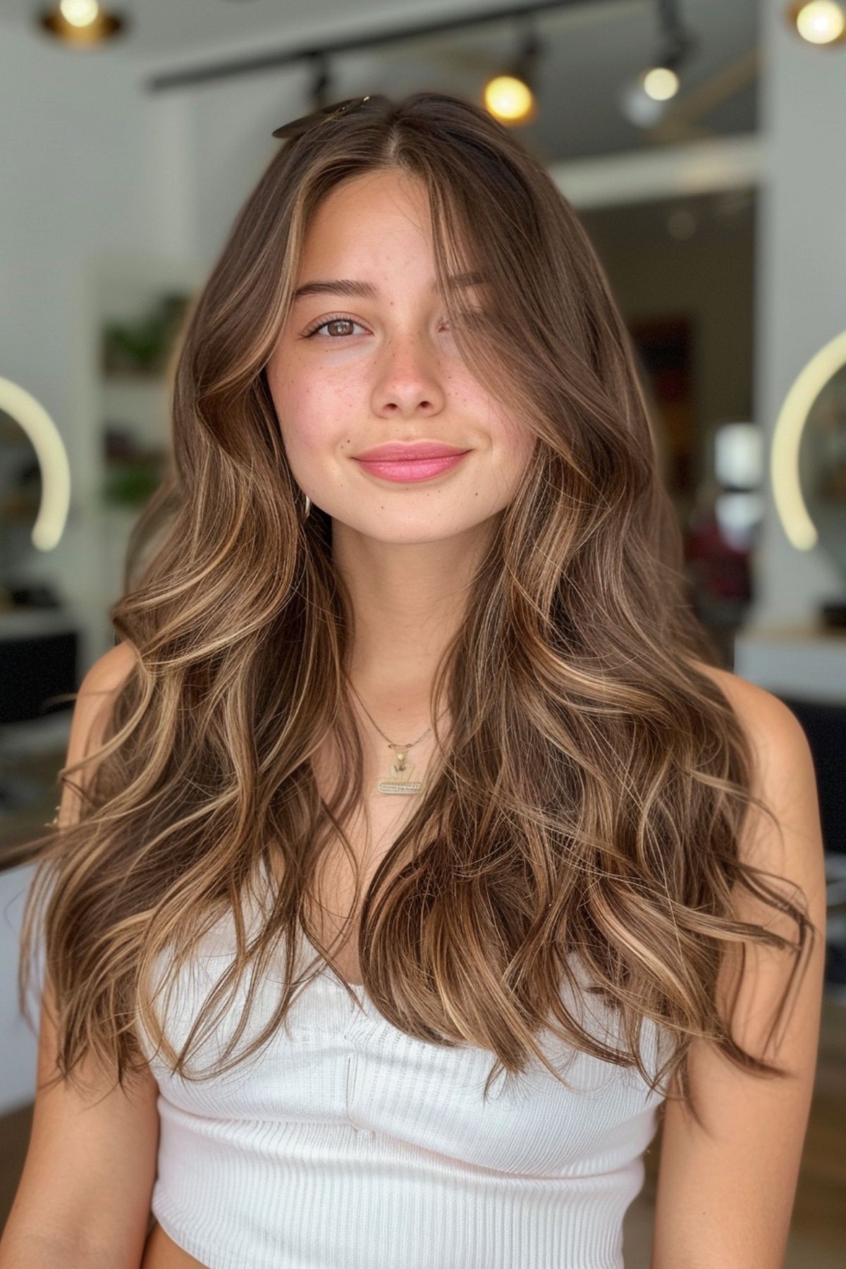 The long, layered waves in this style are a true celebration of dimension. The base sits in a medium chestnut, lifted with blonde highlights that catch the light beautifully. Perfect for women with oval or heart-shaped faces, this look enhances length and movement without overwhelming features. It’s versatile—ideal for everyday wear, work settings, or evening outings—but might require upkeep to keep the highlights vibrant.