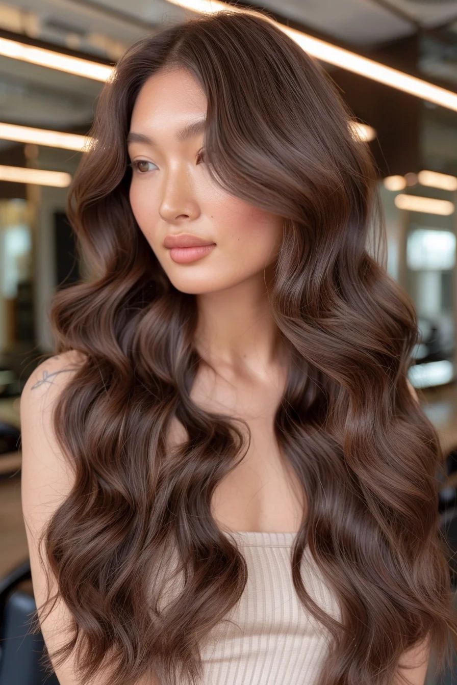 This is the definition of timeless glamour—long, flowing chocolate waves with a glossy finish. The overall look feels polished yet natural, making it a perfect candidate for both casual and elevated occasions. Practical enough for daily wear but best styled for evenings out when shine and movement can be fully appreciated.