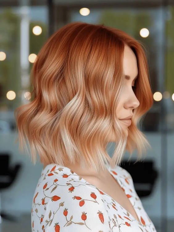 This chic bob combines strawberry and blonde in a trendy ombre effect, perfect for those who prefer a low-maintenance yet stylish look. The shorter length and wavy texture make it playful and versatile, ideal for both professional and casual settings. This look works well for anyone wanting to balance a youthful yet polished appearance.