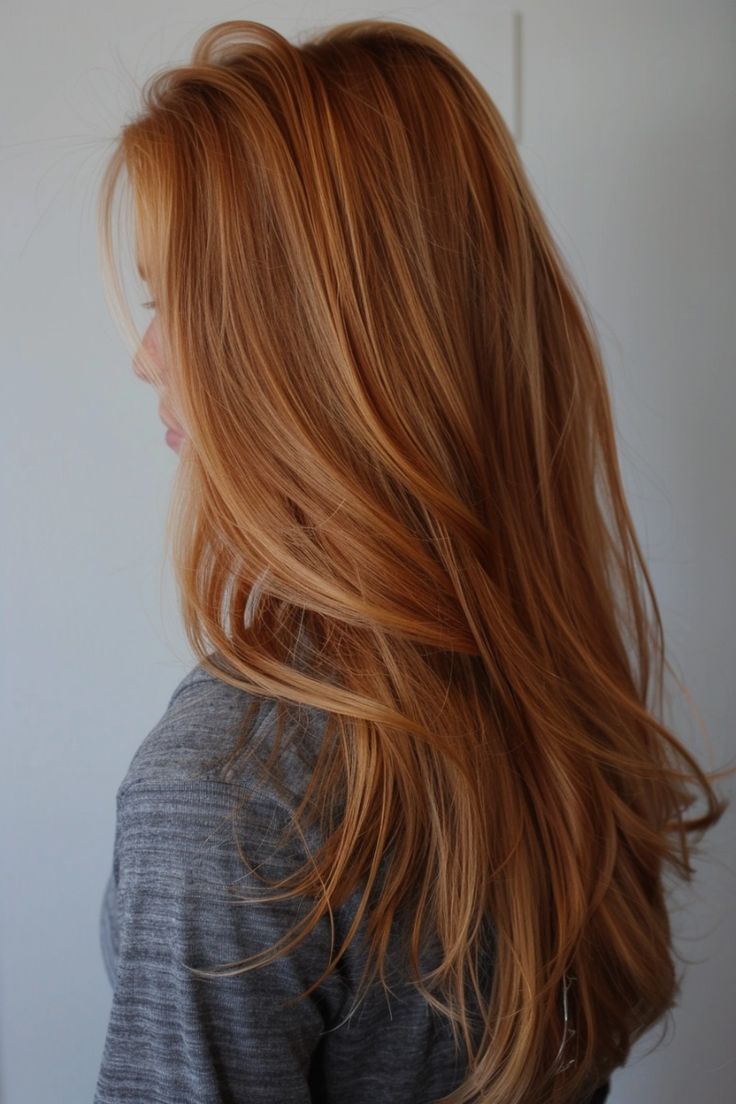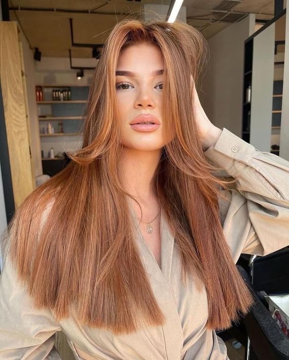 This sleek, straight hairstyle in a muted strawberry shade is all about sophistication. The style offers a smooth, straight texture with a delicate blend of red and chocolate tones, making it suitable for a variety of settings, from casual outings to more formal gatherings. The long layers frame the face beautifully, creating an elongating effect that would suit round or square face shapes well.