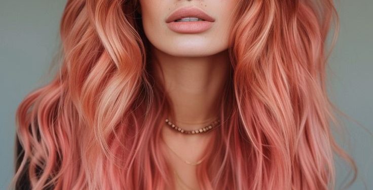 This look radiates an effortless, soft beauty that feels both edgy and elegant. The long, voluminous waves are dyed in a dusty rose gold hue, a shade that balances pink with soft red undertones. This style is ideal for those looking to make a subtle yet impactful statement. The color’s depth and warmth make it suitable for all seasons, particularly fall and winter when richer tones come to life.