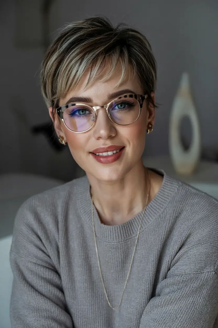 There’s a timeless sophistication to this short blonde pixie paired with softly blended bangs and cool-toned highlights. The subtle graduation frames the face beautifully, especially when combined with statement eyewear. It’s the kind of look that blends warmth with intellect — perfect for women who want their haircut to whisper “effortless authority.” This style works beautifully for oval or heart-shaped faces and is especially flattering for fine hair, as the layered crown creates the illusion of fullness. A perfect everyday cut for work, brunch, or even a formal dinner with minimal styling required.