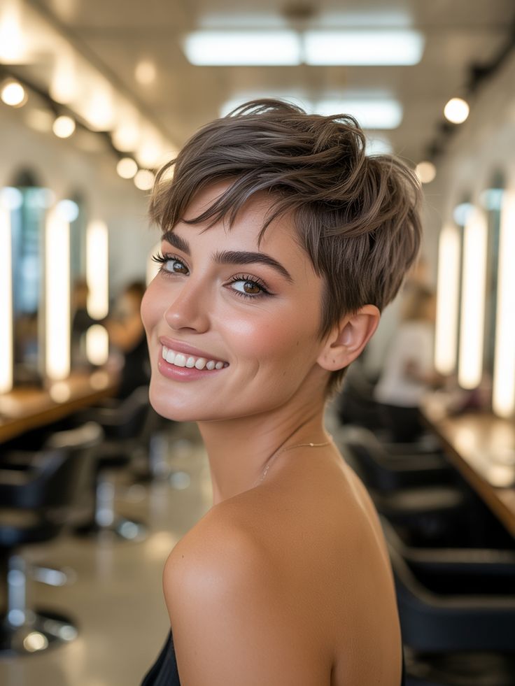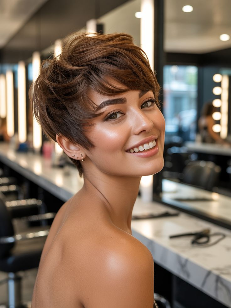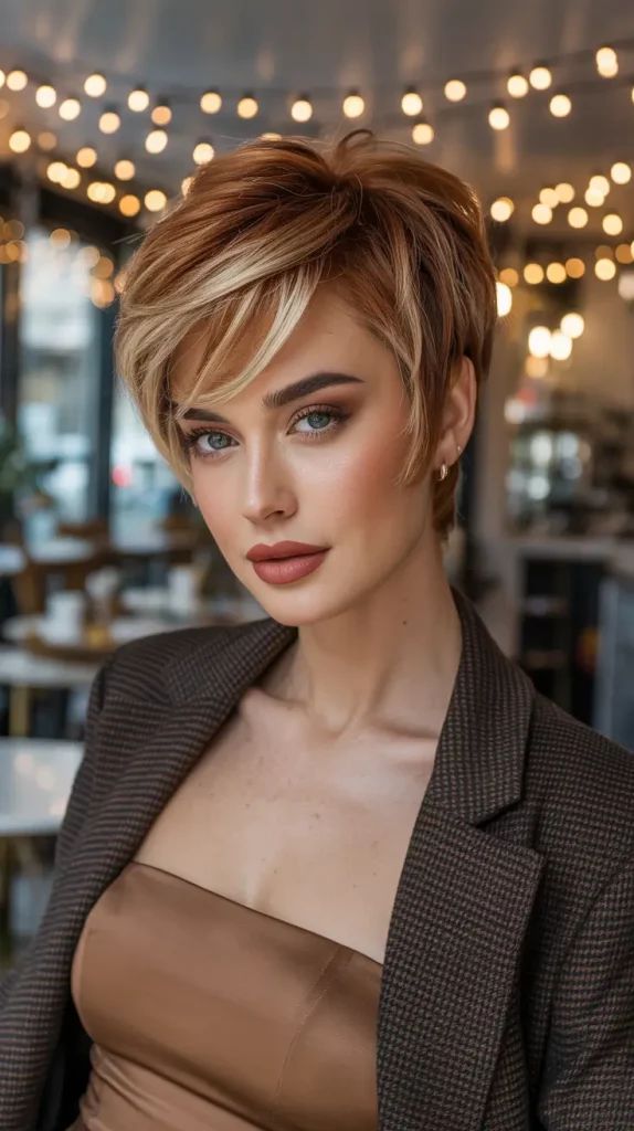 This pixie radiates sunshine. The short layers are swept to one side, creating a feminine, airy effect that frames the eyes and cheekbones. Its golden-brown hue enhances warmth and pairs beautifully with glowy makeup. This style is an easy favorite for women who want a low-maintenance cut that still looks styled.