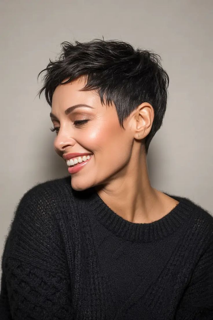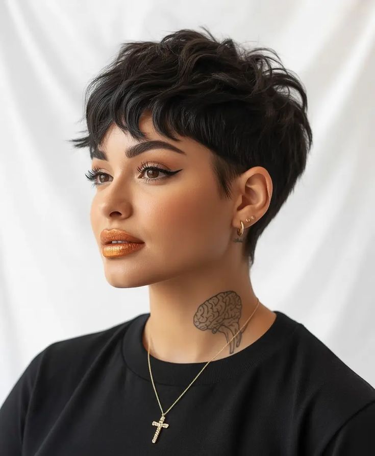 This pixie celebrates curly hair texture with sculpted precision — short layers meet a tousled, fringe-forward silhouette. The bangs soften the forehead while the choppy crown gives a playful, edgy mood. It’s a great pick for fine hair, too, since layering builds volume without heaviness. I love how the warm gold makeup complements the dark crop — it’s the perfect look for creative professionals or older women who want something both modern and easy to style.