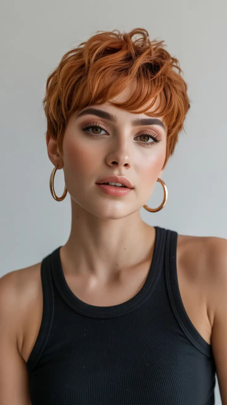 Oh, that short copper hair glow! This is the kind of pixie that feels like sunlight captured in strands. The delicately tousled curly fringe gives this look a flirty, cute quality, while the rich copper hue screams confidence and individuality. It’s a stunning choice for women with fair or warm undertones, and it pairs beautifully with bold jewelry or fresh-faced makeup.