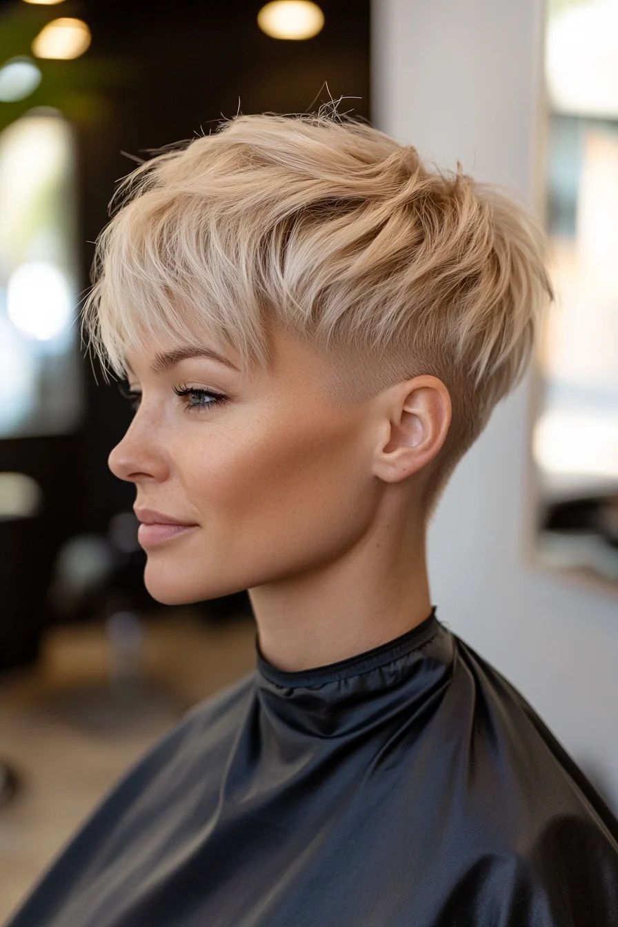 Modern and ultra-edgy, this pixie turns heads instantly. The faded undercut emphasizes bone structure, while the longer top layers deliver balance and softness. It’s a great option for thick hair or those with fine hair seeking more contrast. The clean lines make it ideal for creative workplaces or weekend city strolls — definitely one for women who love a bold statement.