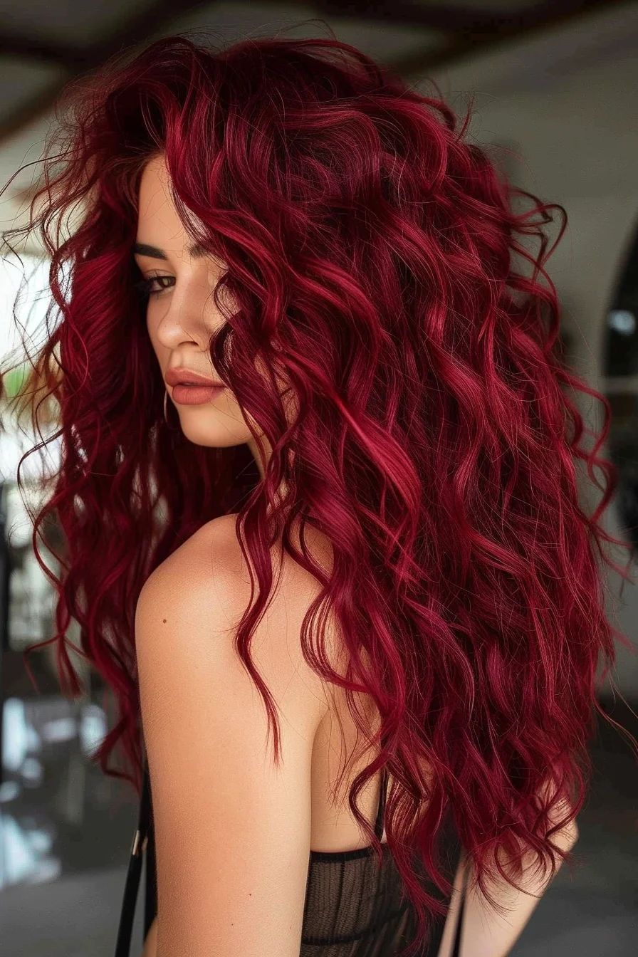 A voluminous, curly burgundy mane like this speaks of confidence and creativity. The hue leans toward wine with a bold saturation that flatters morena complexions beautifully. Its texture adds a playful edge, making it perfect for art openings, live concerts, or bold street-style moments.