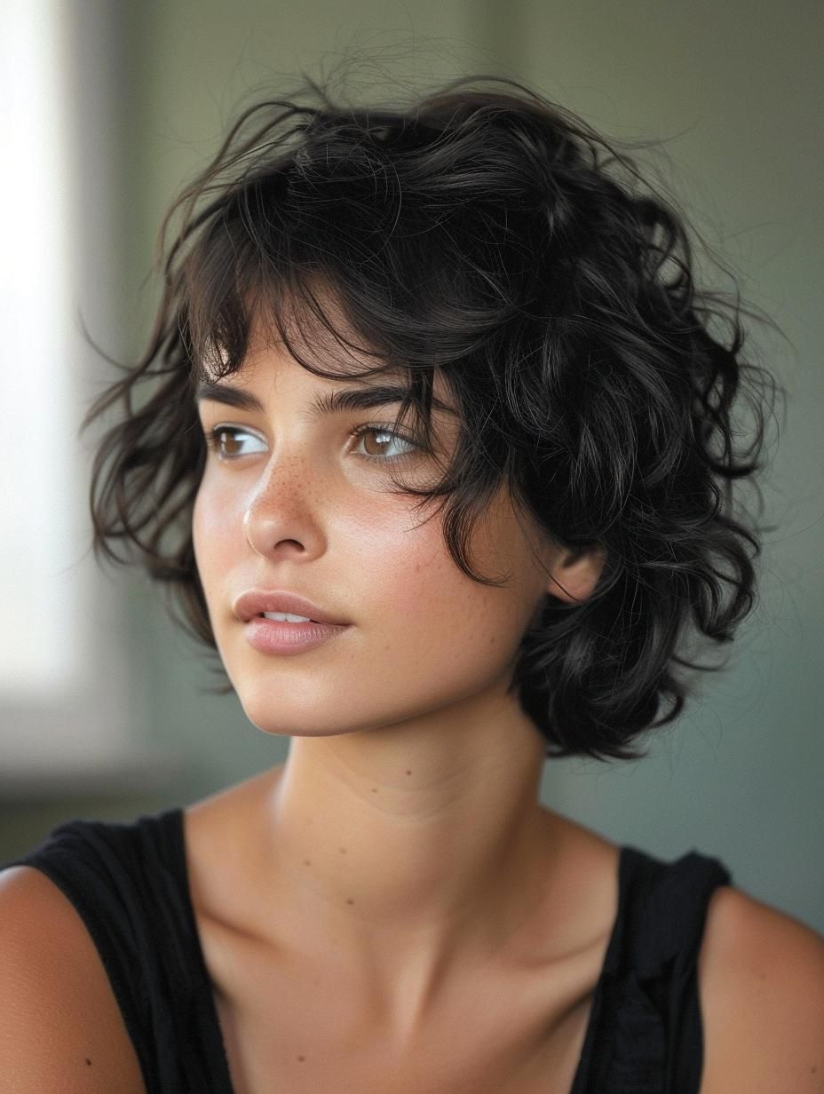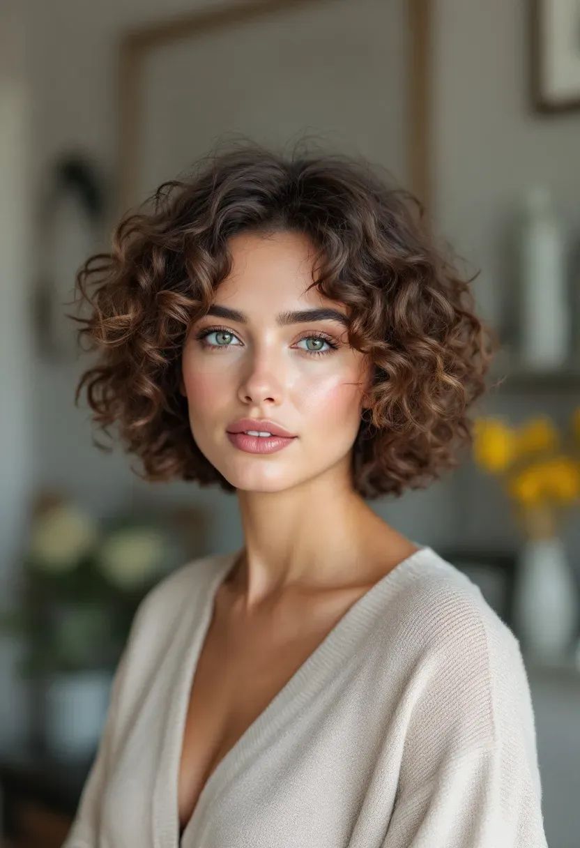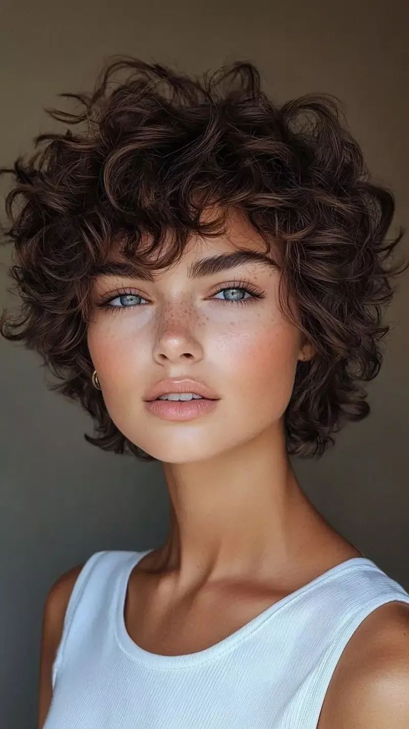 This tousled curly bob is full of life and texture, offering a carefree, modern approach to styling. The soft brunette curls frame the face beautifully while allowing natural freckles and eye color to stand out. It’s adaptable—wear it to work, casual weekends, or even evening outings. A go-to among ideas for women who want low-maintenance chic.