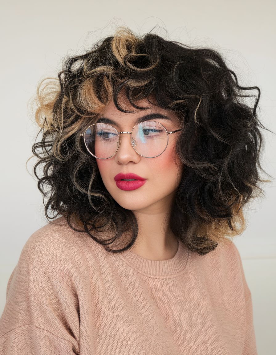 Here we see volume meet statement color. The layered mid-length cut allows curls to expand outward, with bold blonde streaks highlighting movement. The oversized round glasses enhance the intellectual yet playful feel of this look. This haircut is great for plus size women, as the volume balances fuller features. It’s not ideal for those who prefer minimal styling since curls this big often need definition products.