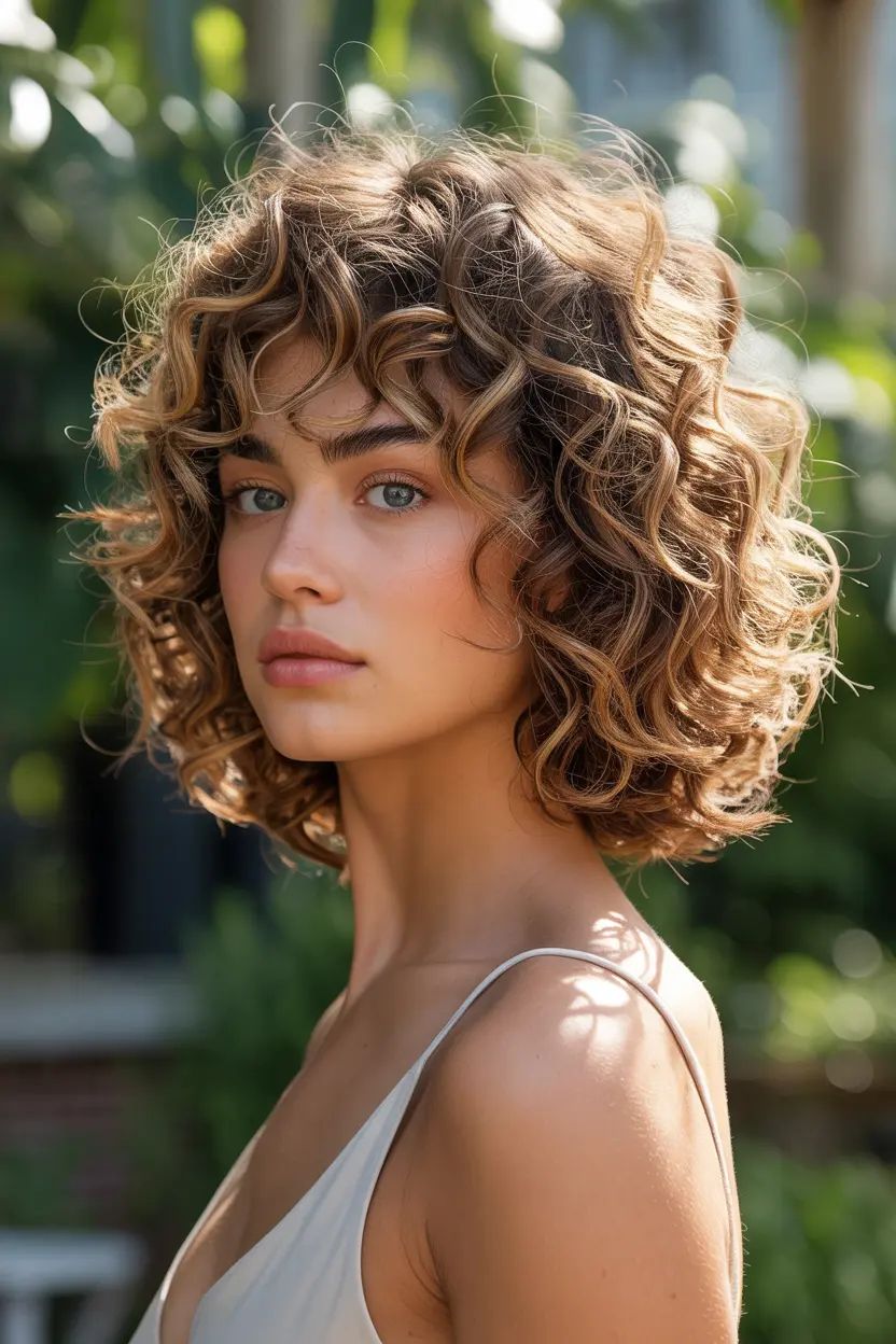 Golden highlights woven through curls create a sun-kissed effect, making this look perfect for spring and summer. It flatters ideas oval face and longer necklines since the cut lifts the profile. Practical for women’s everyday style, yet elevated enough for outdoor weddings or vacations.