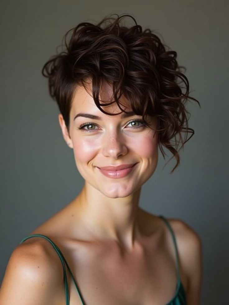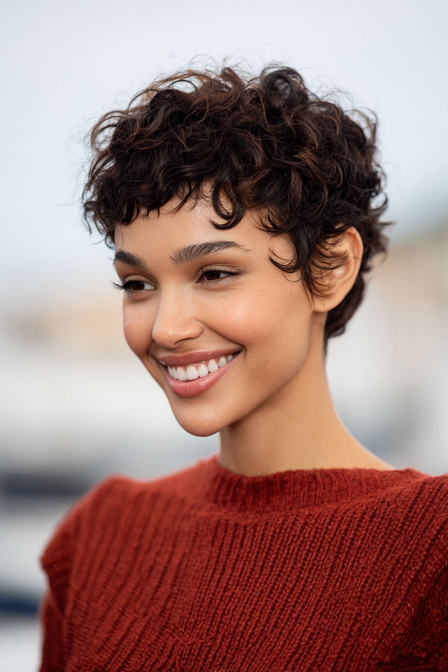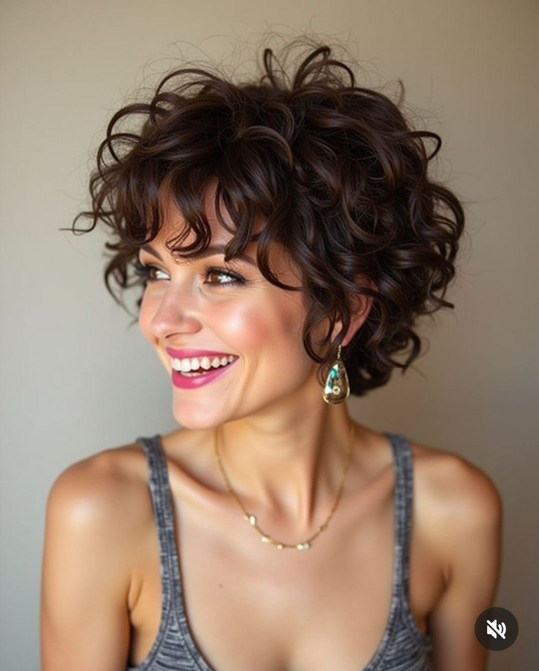 Short, playful, and full of charm, this cut is made for bold personalities. The tight curls add drama to the pixie shape, while the deep brunette shade feels modern and chic. Paired with statement earrings and a textured bronze top, this look leans sophisticated yet spirited. Best for ideas oval face, since the cut elongates the profile while emphasizing cheekbones.
