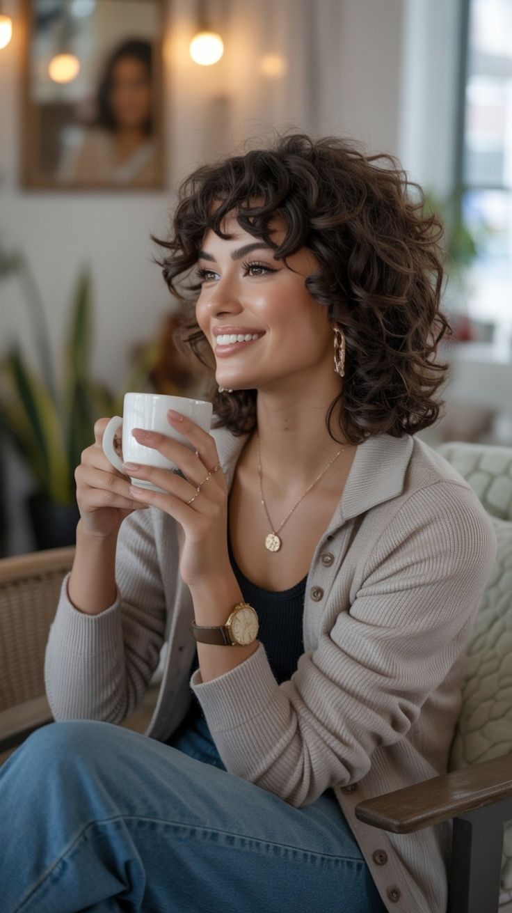 This style blends structure and ease, offering a flattering balance for different face shapes. The shaggy layers add volume and movement, while the loose curls frame the face in a soft halo. Paired with layered jewelry and a casual cardigan, it’s the definition of relaxed chic—perfect for brunch, study sessions, or cozy coffee shop vibes. A strong contender among ideas for women who crave versatility.