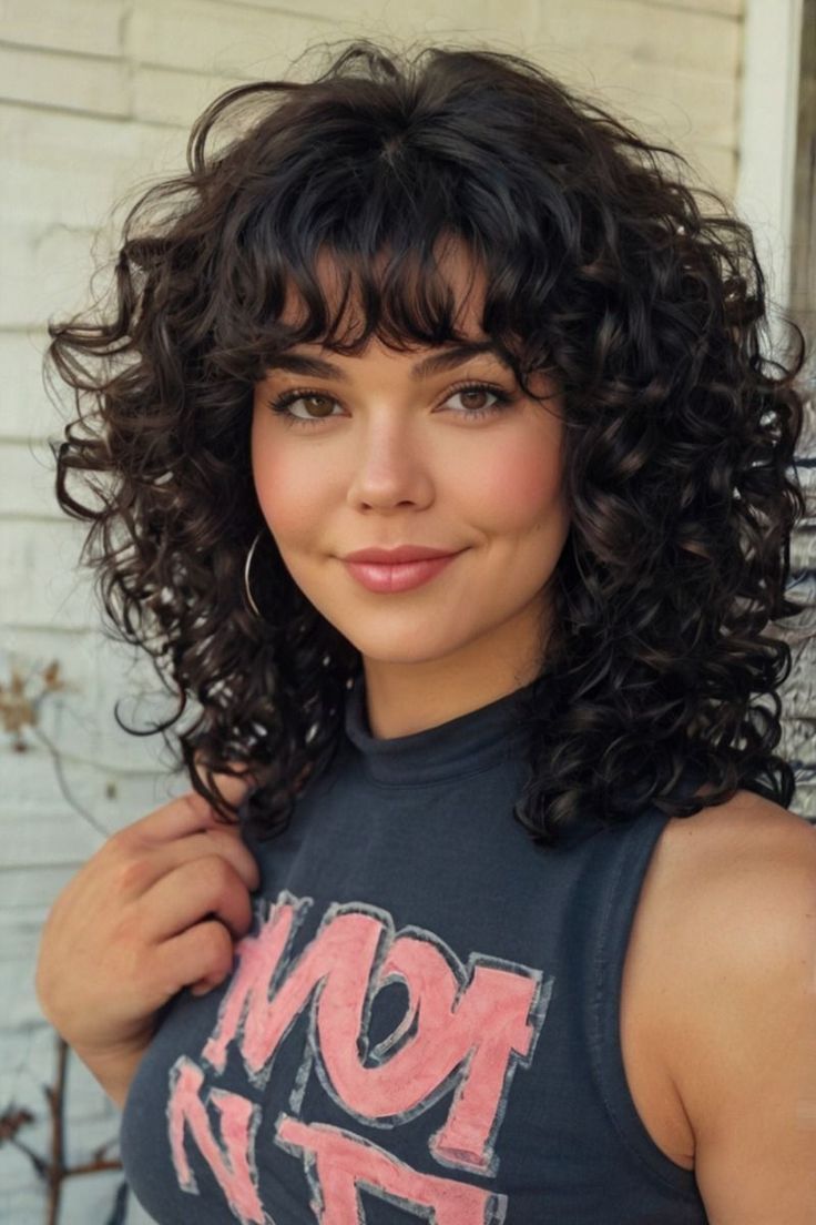 This hairstyle makes a statement with bold, springy curls and fringe. The bangs add personality, making it a playful yet chic option. Teamed with a sleeveless graphic tee and hoops, the look leans casual but edgy, perfect for concerts, festivals, or weekend street style. A bold take on bangs round faces, adding freshness and balance.